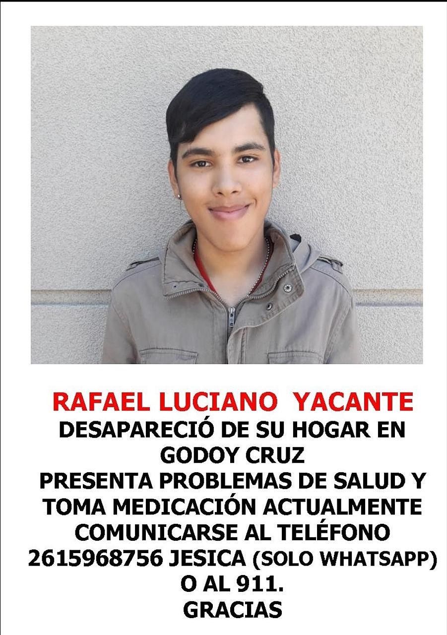 Su madre informó que al momento de la desaparición su hijo vestía remera blanca, pantalón tres cuartos con el escudo del club de fútbol mendocino Godoy Cruz Antonio Tomba.