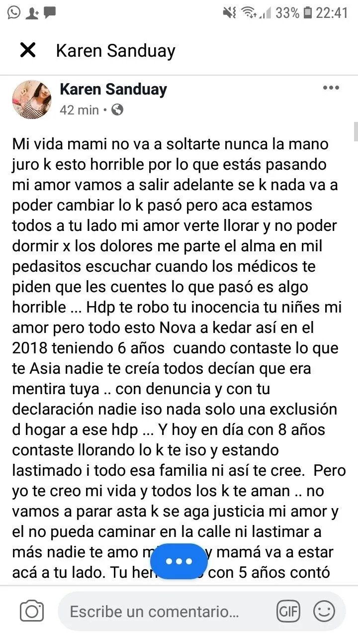 A raíz de las heridas, la semana pasada el niño se atrevió a contarle a su madre lo que estaba sucediendo, aunque ya lo había hecho cuando tenía 6 años pero nadie le creyó pese a que la madre realizó una denuncia que derivó en la exclusión del hogar para el agresor.