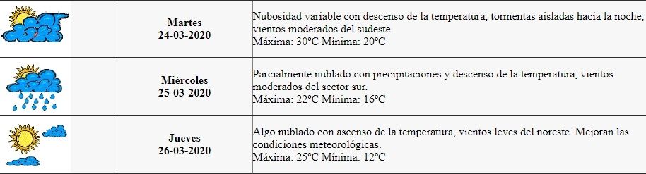 "Nubosidad variable con descenso de la temperatura, tormentas aisladas hacia la noche, vientos moderados del sudeste. Máxima: 30ºC, Mínima: 20ºC", es el pronóstico de la Dirección de Contingencias Climáticas para hoy.