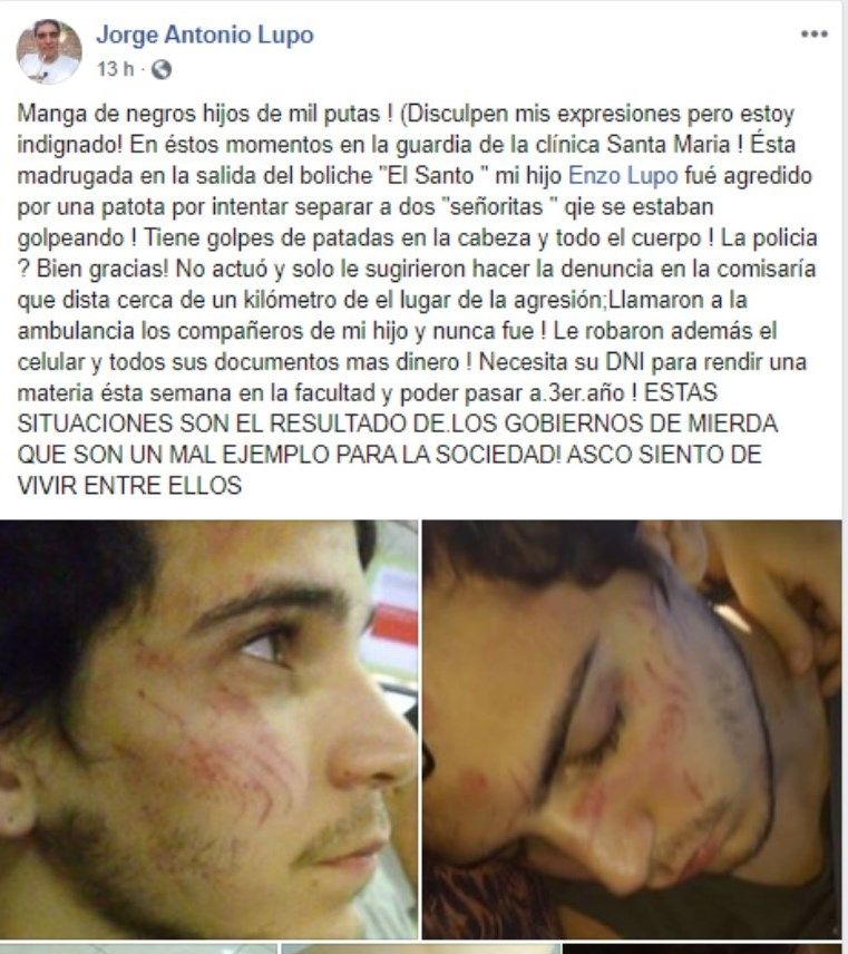 En las redes, Enzo comunicó este lunes que ya está mejor. Su padre, por otra parte, publicó un mensaje lamentando lo ocurrido. Eso sí: su retórica no parece destinada a aplacar los ánimos de una sociedad cada día más violenta.