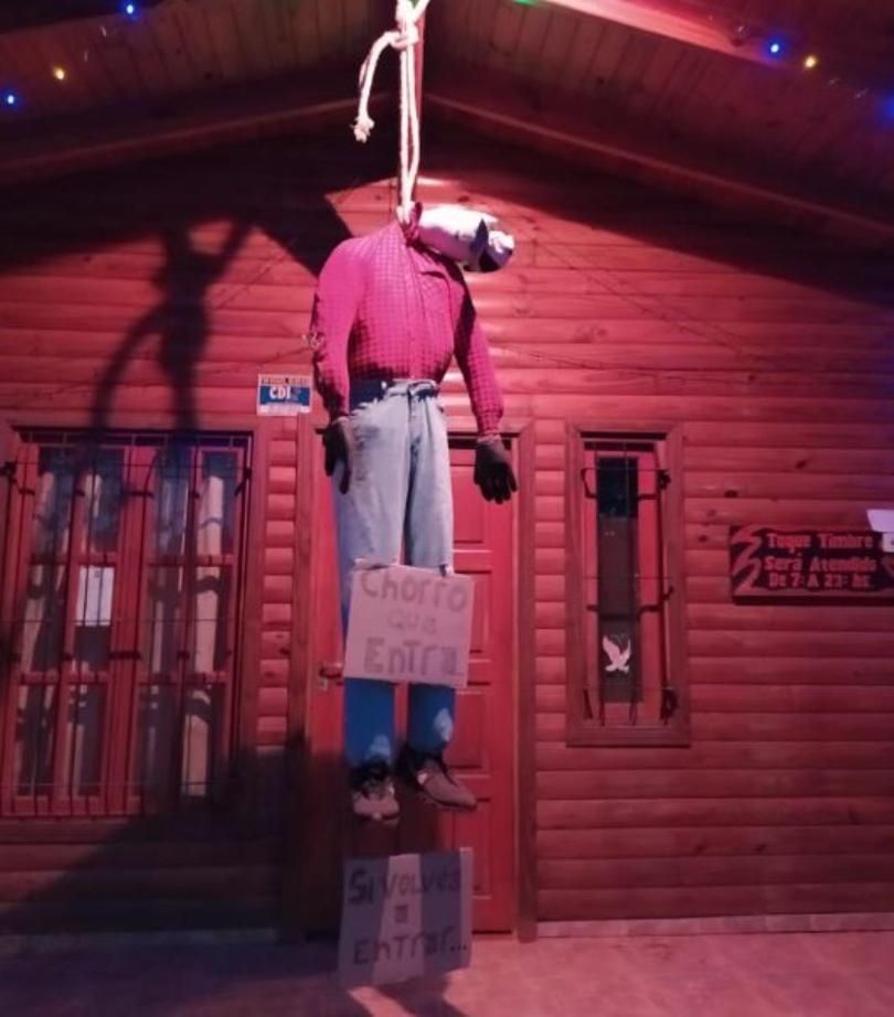 Colgaron un muñeco del cuello para intimidar ladrones: "Chorro que entra..."