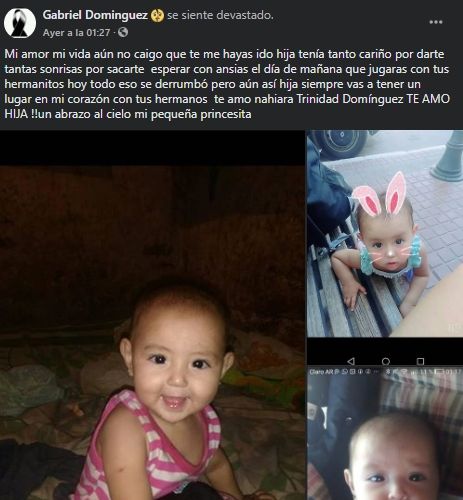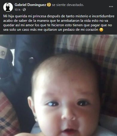 El padre de la pequeña, Gabriel Domínguez, publicó un desgarrador mensaje lamentando lo ocurrido y reclamando justicia. "Mi hija querida, mi princesa, después de tanto misterio e incertidumbre acabo de saber de la manera en que te arrebataron la vida. Esto no va quedar así, mi amor. Los que te hicieron esto tienen que pagar, que no sea solo un caso más, me quitaron un pedazo de mi corazón", se lamentó el hombre en su cuenta de Facebook.