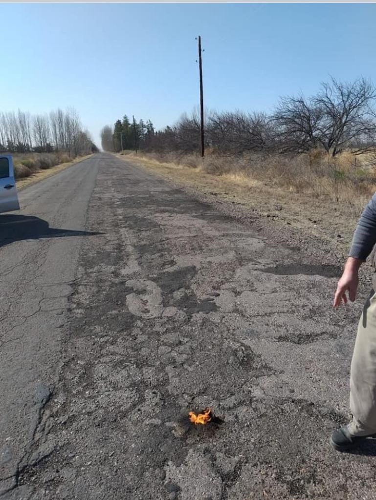 Por las redes sociales corren mil versiones. Se habla de sujetos que se movilizan en un auto azul o en moto, y que llevarían antorchas con aceite como la que se ve sobre el asfalto en la imagen que está más abajo. Cuando los vecinos intentan identificarlos, ellos huyen rápidamente.