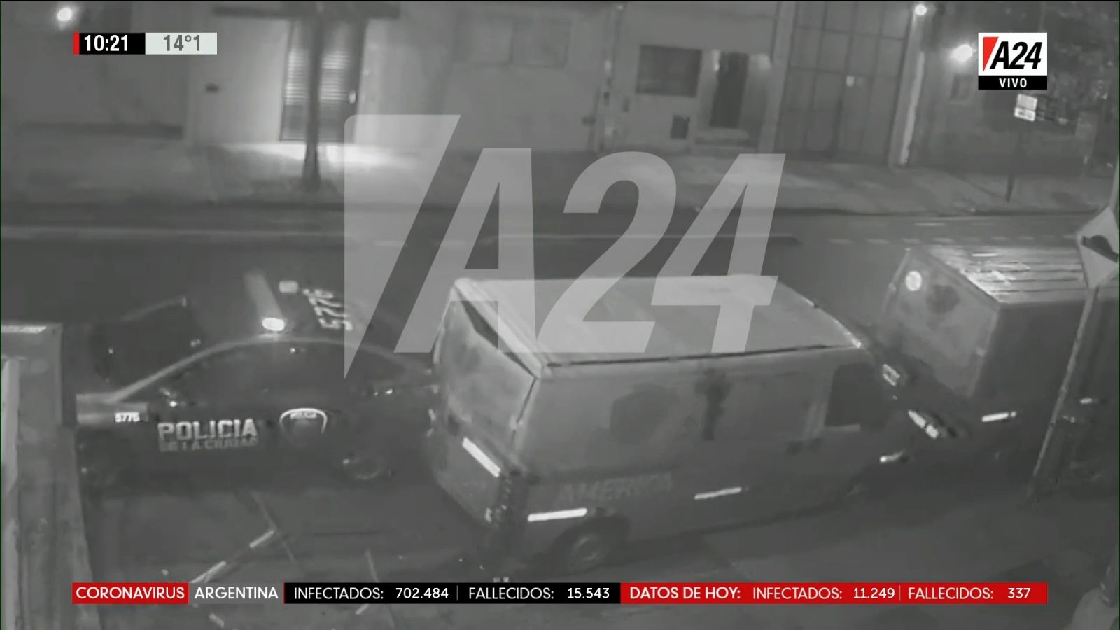 Parte de la huida de las personas que participaron de la fiesta quedó registrada en las cámaras de seguridad de América. Allí, se ve también la persecución de un móvil policial por la calle Gorriti que pierde el control, queda de contramano y choca por su parte trasera contra uno de los camiones de exteriores del canal.