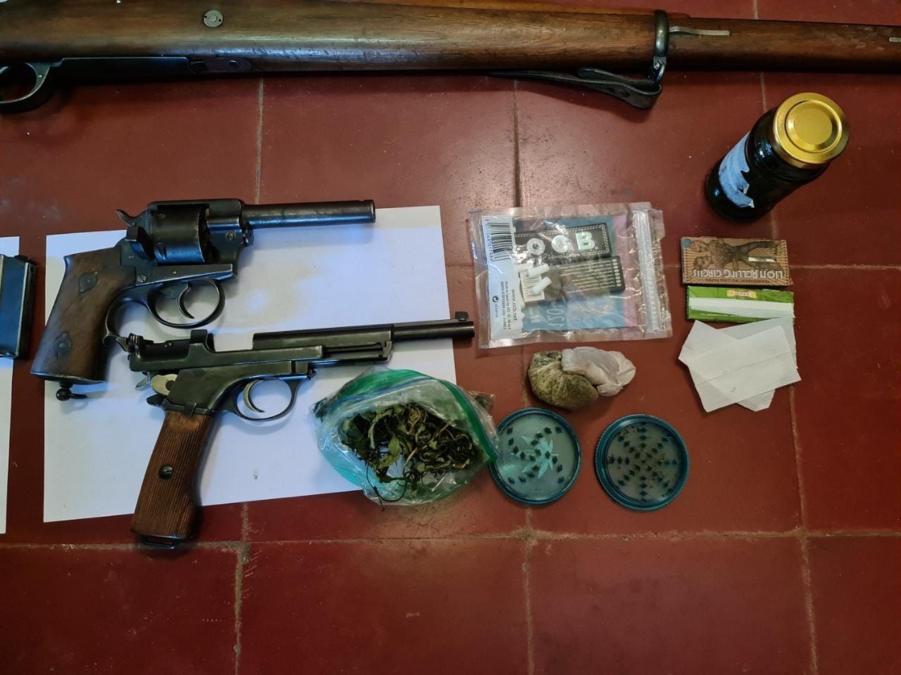 En el lugar, secuestraron dos plantas de marihuana, marihuana en proceso de secado y en picadura, un frasco de aceite de cannabis, filtros para cigarrillos, un molinillo, y siete armas. Según trascendió, se trata de un fusil Mauser calibre 765, sin número serie visible, un fusil Remington Patria modelo 1879 sin número serie visible, un rifle calibre 22 MLE 1924, una carabina automática calibre 22 Stano 700, P.A. n 115251 y 115277. Número serie 85182, con mira telescópica marca Shilba Japón, una escopeta doble caño, un revólver, una pistola Mannlicher, tres cargadores calibre 22 vacíos y cartuchos, calibre 765, 306, 38. 44, 22.
