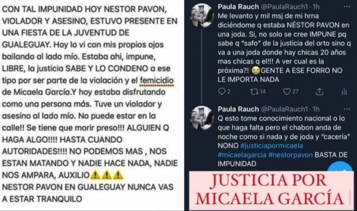 Según indicó un comunicado viralizado por redes sociales, “con tal impunidad hoy (madrugada del domingo) Néstor Pavón, violador y asesino, estuvo presente en una fiesta de la juventud de Gualeguay”.