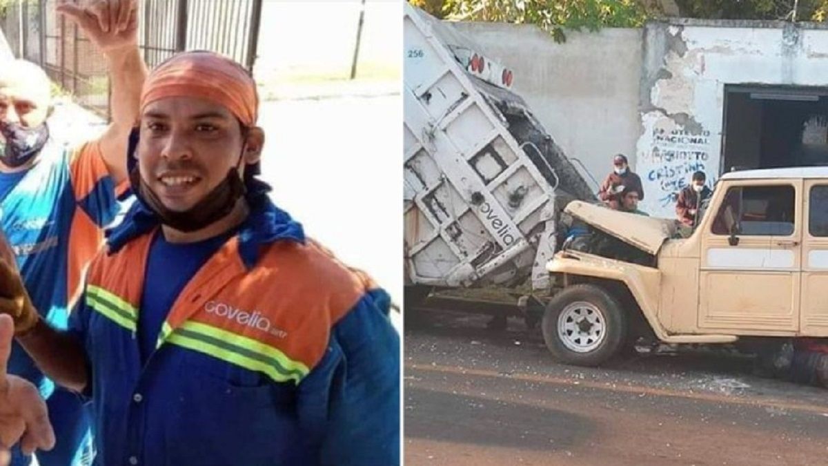 El joven iba colgado de la parte trasera del camión recolector cuando una camioneta chocó contra la parte trasera del camión y aplastó al recolector.