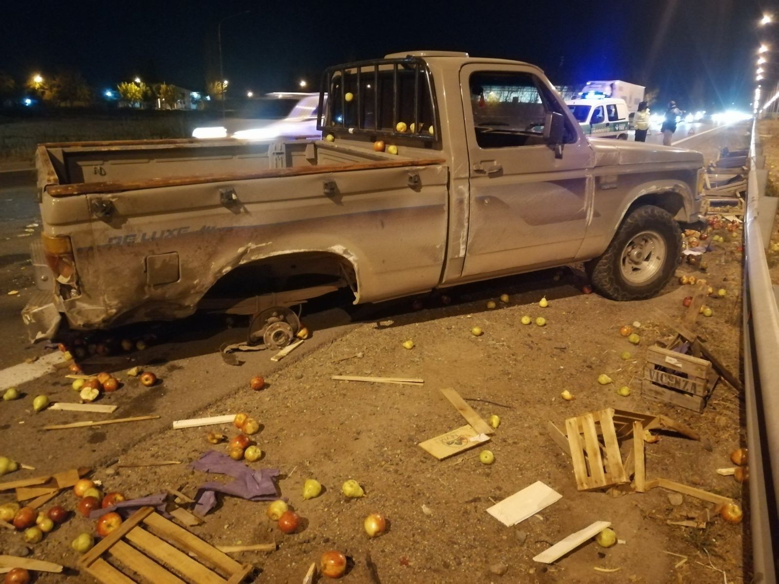 La caja del vehículo venía completamente cargada de peras y manzanas que terminaron desperdigadas sobre el Acceso Sur, ya que tras el desperfecto la camioneta terminó chocando contra el guardarrail.
