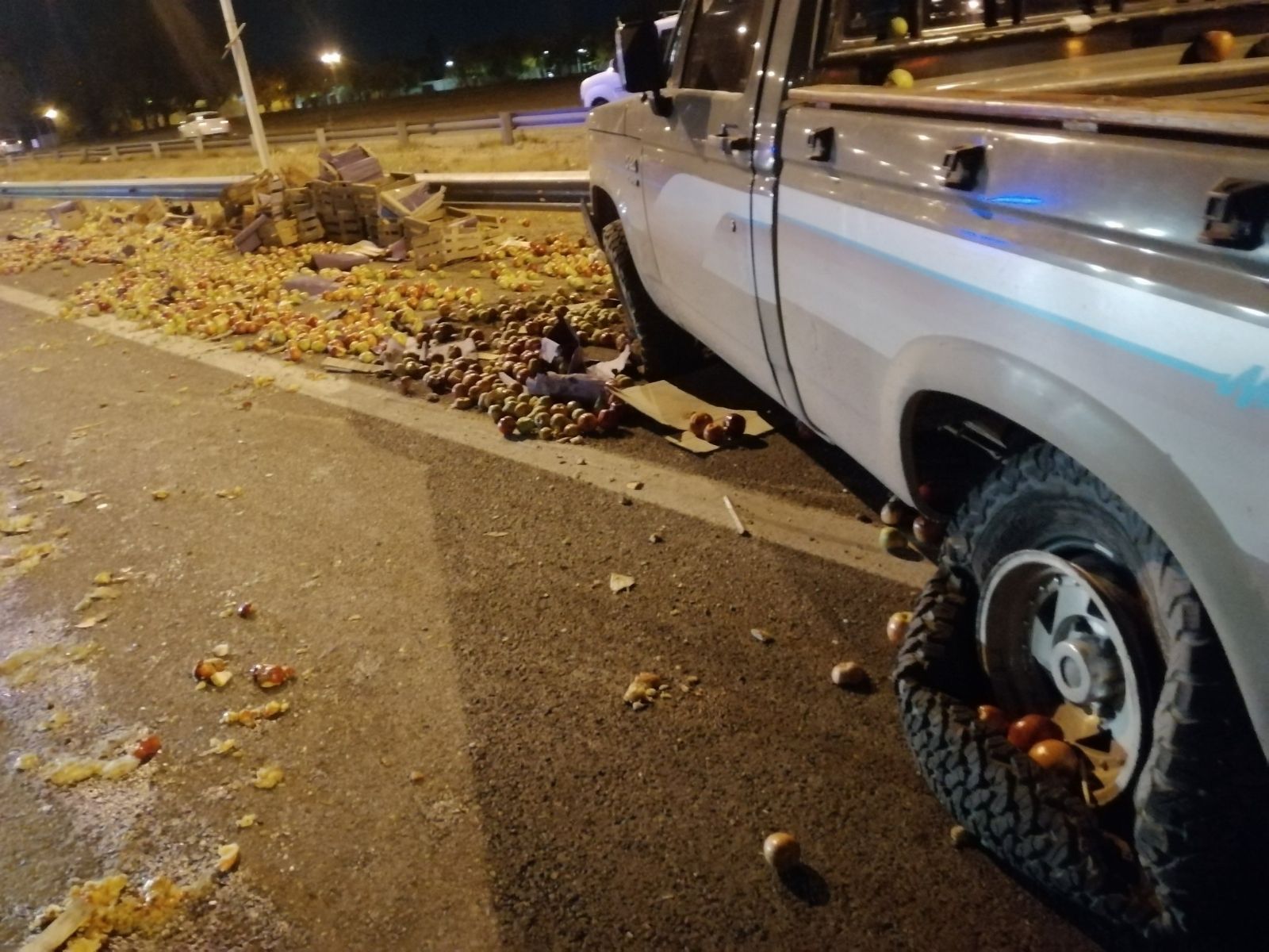 Un desperfecto en una camioneta complicó el tránsito este jueves por la mañana en el Acceso Sur. El rodado que venía cargado con frutas perdió una de sus ruedas, por lo que el conductor no pudo dominarlo y toda la carga cayó al asfalto.