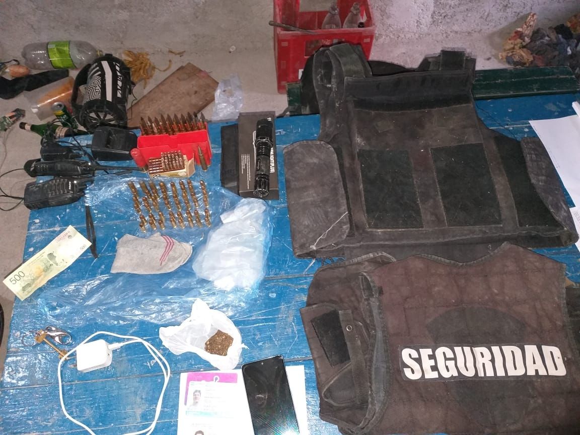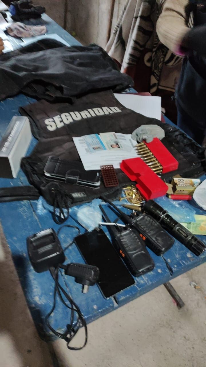 Asimismo, los investigadores secuestraron un rifle de color negro con la inscripción SAG, un rifle de aire comprimido color negro y marrón con la inscripción Lee made in China, un explosor que se utiliza para mandar carga eléctrica a un detonador de explosivos, dos chalecos de tela, uno de color gris y el otro marrón camuflado, 21 cartuchos calibre 7,65, 3 calibre 44, un calibre 45, 44 calibre 9 mm, 2 vainas servidas calibre 14, un cartucho calibre 12, 2 inhibidores con un cargador, una linterna picana, un chaleco de transporte inscripción seguridad, un chaleco antibala marca RBR Internacional lote DEO 1236 color negro.