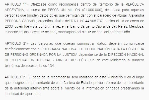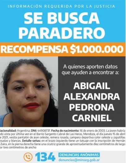 El Ministerio de Seguridad de la Nación ofrece una recompensa de un millón de pesos para quienes puedan aportar información certera sobre el paradero de Abigail Alexandra Pedrona Carniel, la joven mendocina de 18 años que lleva dos meses desaparecida. La recompensa fue ofrecida a través de la Resolución 270/2021, publicada en el Boletín Oficial de hoy.