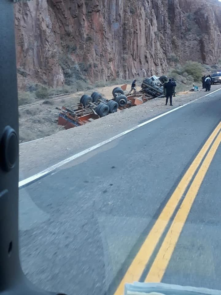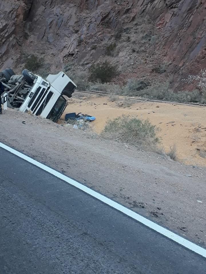 Esta mañana se produjo un espectacular vuelco en el camino que une Mendoza con Chile. Cerca de las 10, un camión Volvo que circulaba con sentido oeste -en dirección al país vecino- se salió del asfalto y terminó volcando sobre un lateral.