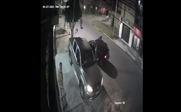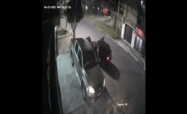 En las imágenes captadas por las cámaras de seguridad de la zona, se ve a dos delincuentes abordando a la víctima para robarle la camioneta.