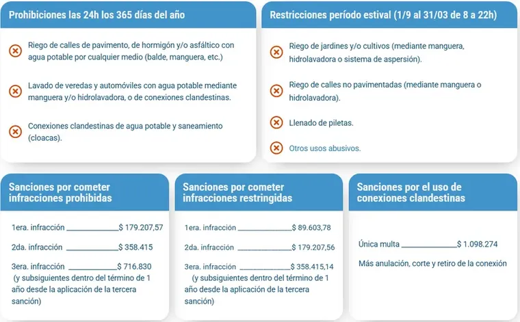 Más allá del verano, hay un paquete de conductas que están vetadas durante todo el año y a cualquier hora. Entre ellas se incluyen el riego de calles pavimentadas, el lavado de veredas y vehículos con manguera directa y el uso de conexiones clandestinas tanto de agua potable como de cloacas. Estas faltas se castigan con un esquema progresivo: la primera vez, la multa es de $179.207,57; si se repite, sube a $358.415, y a partir de la tercera llega a $716.830. La lógica es clara: quien insiste en ignorar las reglas paga cada vez más caro. El mensaje oficial apunta a que no se trata solo de una obligación legal, sino de una responsabilidad con el resto de la población, que depende de la misma fuente de agua en una de las provincias más áridas del país.