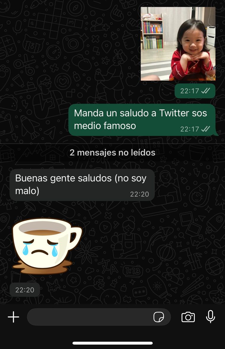 La situación se tornó casi absurda cuando, en tono amistoso, el interlocutor terminó enviando un saludo a las redes del propio usuario: “Buenas gente, saludos (no soy malo)”, acompañado de un sticker.