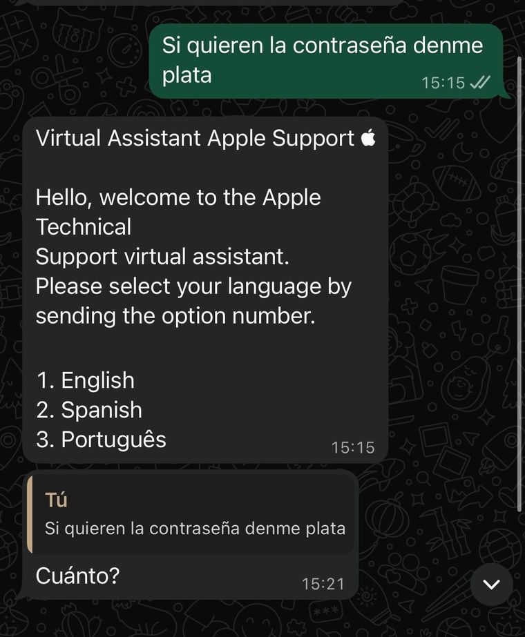 La surrealista charla muestra cómo, detrás de un número con logo de Apple y mensajes automáticos, apareció una negociación: primero le ofrecieron pagarle para que entregara la clave, y después, al ver que no cedía, intentaron arreglar por más dinero y un pago a través de Rapipago.