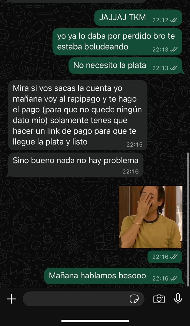 "Yo ya lo daba por perdido bro, te estaba boludeando. No necesito la plata", le contestó ella cuando él le ofreció 50 mil pesos. "Mira si vos sacas la cuenta, yo mañana voy al Rapipago y te hago el pago (para que no quede ningún dato mío) solamente tenes que hacer un link de pago para que te llegue la plata y listo. Sino bueno nada no hay problema".