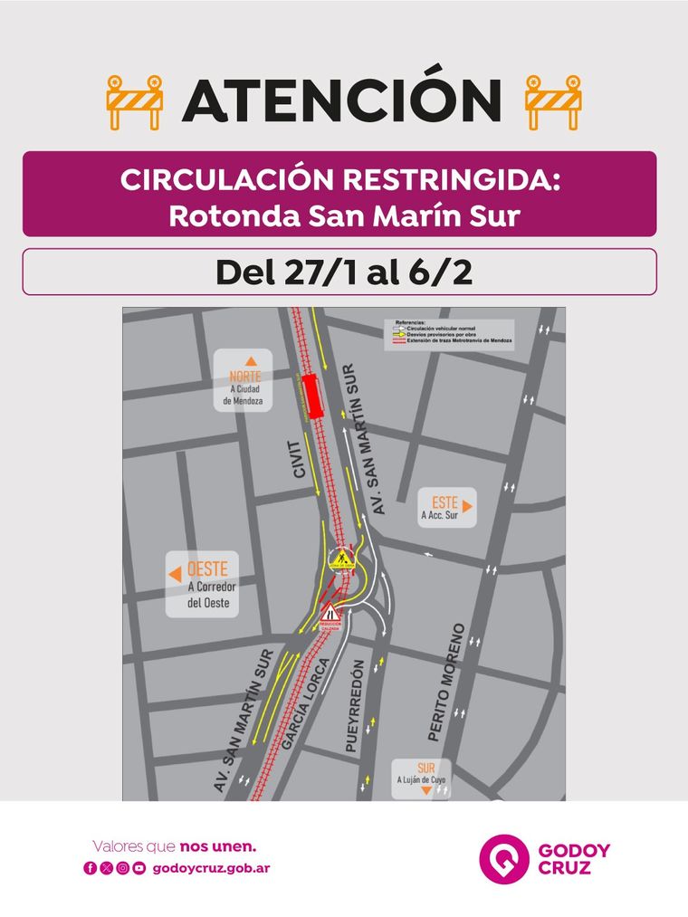 Quienes circulen desde el Norte hacia Luján de Cuyo deberán desviar su recorrido y continuar con precaución por la vía contraria de la rotonda. Este desvío se mantendrá durante aproximadamente diez días, por lo que se solicita especial atención a vecinos y conductores.
