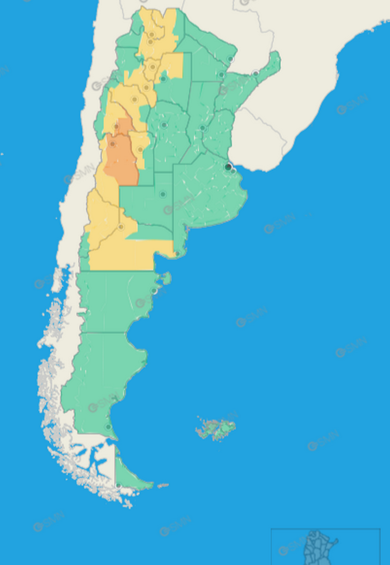 En tanto, las provincias bajo alerta amarilla son Buenos Aires, Santa Fe, Entre Ríos, Corrientes, Santiago del Estero, Chaco, Formosa, Salta, Jujuy, Mendoza, La Pampa, Neuquén, Río Negro y Chubut.