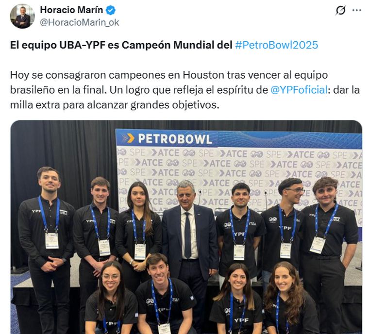 El anuncio de la victoria fue realizado por Horacio Marín, presidente y CEO de YPF, a través de sus redes sociales. “Hoy se consagraron campeones en Houston tras vencer al equipo brasileño en la final. Un logro que refleja el espíritu de YPF: dar la milla extra para alcanzar grandes objetivos”, publicó al felicitar a los integrantes del equipo.
