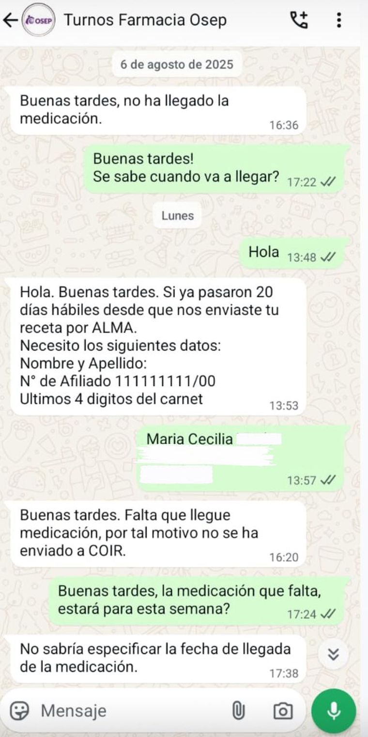 Otro de los casos es el de Alejandra, quien tiene cáncer de mama desde 2019. Actualmente tiene metástasis hepática por lo que está en plan de quimioterapia. Según contó la mujer, en los últimos meses OSEP no envía la medicación al lugar en el que realiza la quimioterapia, y cuando va a hacer los reclamos correspondientes, no la reciben personalmente desde Auditoría Oncológica. Le piden que se comunique por WhatsApp.