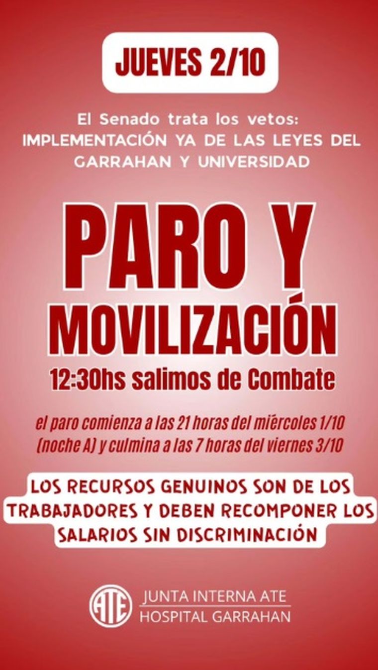 El paro comenzó a las 21 del miércoles y se extenderá hasta las 7 de este viernes 3 de octubre, afectando las actividades habituales del centro médico de referencia pediátrica. En un comunicado difundido en redes sociales, los trabajadores remarcaron: "Los recursos genuinos son de los trabajadores y deben recomponer los salarios sin discriminación".