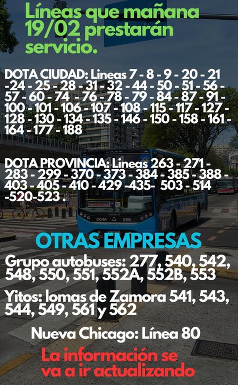 Desde cuentas especializadas en tránsito informaron que estas serían, por ahora, las líneas que prestarían servicio, con la aclaración de que la información se actualizará ante cualquier cambio: