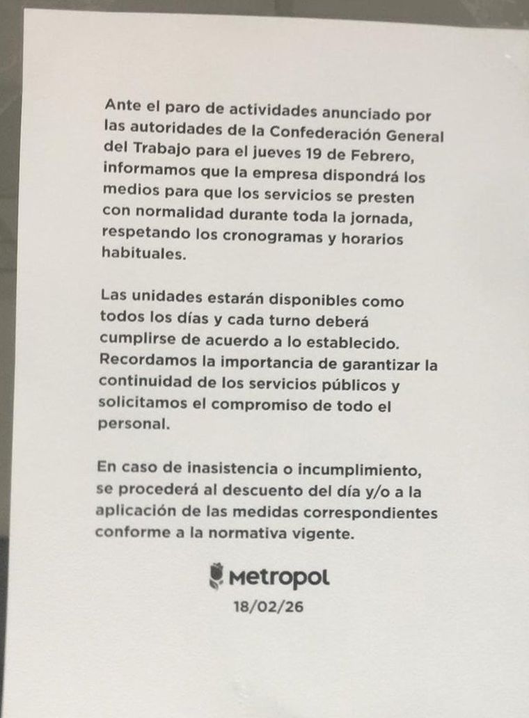 Uno de los mensajes que circuló en las últimas horas es el de Metropol. Allí la firma informa que “dispondrá los medios para que los servicios se presten con normalidad durante toda la jornada”, respetando los cronogramas habituales. También advierte que ante inasistencia o incumplimiento “se procederá al descuento del día y/o a la aplicación de las medidas correspondientes conforme a la normativa vigente”.