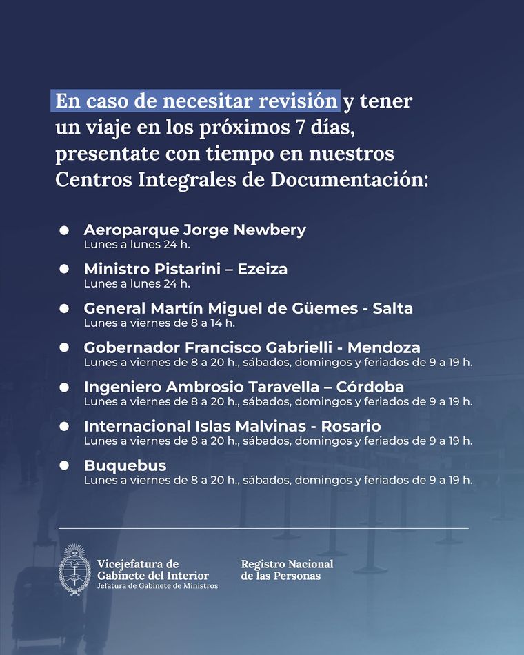 Cuando la respuesta indique que el pasaporte debe revisarse y tu vuelo o embarque es dentro de los próximos siete días, Renaper sugiere presentarse con margen en los Centros Integrales de Documentación ubicados en aeropuertos y en Buquebus. El trámite, según disponibilidad, puede resolverse en un rango de 2 a 6 horas. ¿Dónde se atiende? En Aeroparque Jorge Newbery y en el Aeropuerto Internacional Ministro Pistarini (Ezeiza) la atención es continua, las 24 horas, todos los días.