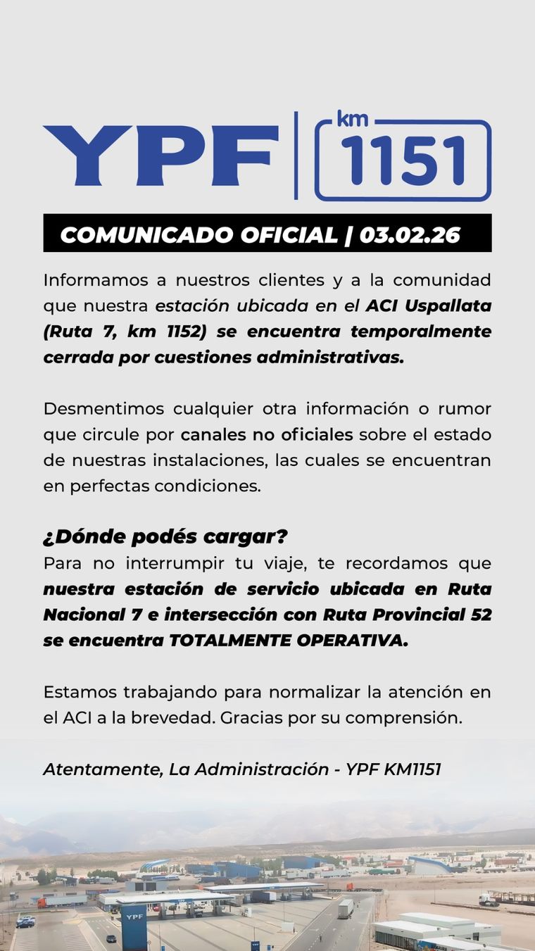 Desde la YPF del km 1152 también recordaron que la estación ubicada en la intersección de Ruta Nacional 7 y Ruta Provincial 52 continúa operativa, para no afectar a quienes transitan por la montaña. Mientras tanto, indicaron que ya trabajan para normalizar la situación y reabrir el predio clausurado.