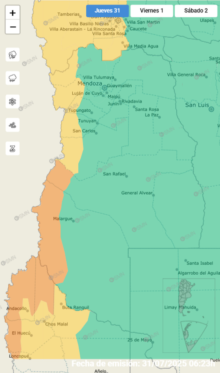 A su vez, este jueves rige una alerta naranja en las zonas cordilleranas de Malargüe y San Rafael: "El área será afectada por nevadas persistentes. Se prevén valores de nieve acumulada entre 50 y 90 centímetros en todo el período de alerta, pudiendo ser superados de forma puntual. La situación estará acompañada por vientos intensos, con posible ocurrencia de viento blanco". En estas zonas las nevadas estarán presentes durante toda la jornada pero sobre la tarde estas se intensificarán.