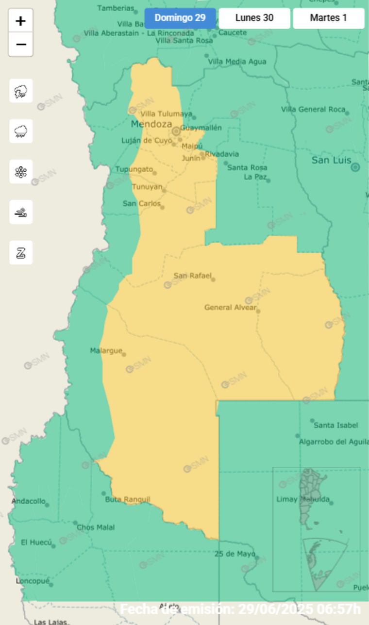 Victoria BocanegraEste domingo 29 de junio se perfila como uno de los días más fríos del año en Mendoza. Según el pronóstico del Servicio Meteorológico Nacional, se espera cielo mayormente nublado, precipitaciones aisladas y una importante caída de la temperatura con una máxima que apenas alcanzará los 2°C y una mínima de -1°C.