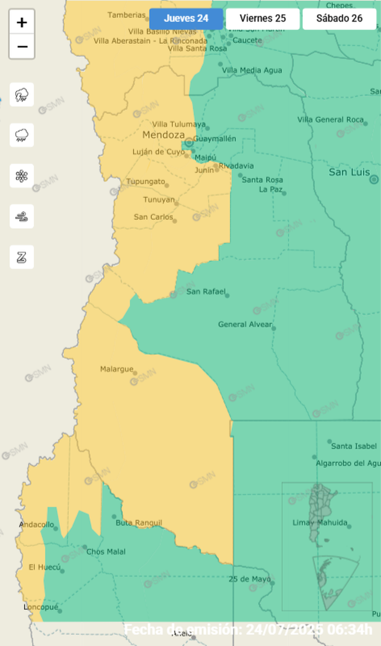 Sin embargo, lo más importante del día es la alerta amarilla vigente en la zona cordillerana. El aviso abarca los departamentos de Malargüe, San Rafael, San Carlos, Tunuyán, Tupungato, Luján de Cuyo, Junín y el este de Las Heras.