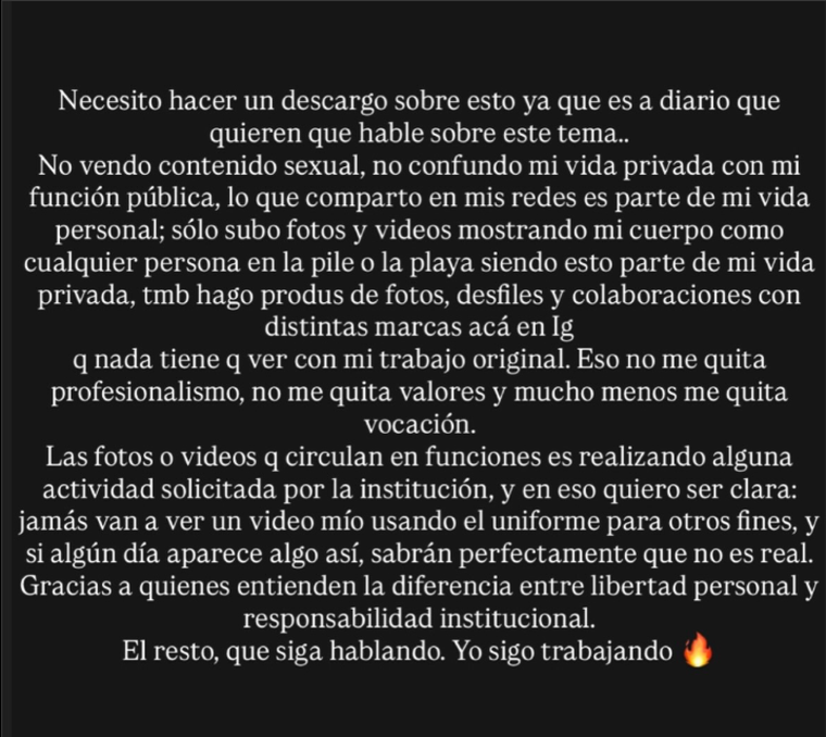 Luego agregó: "Que nada tiene que ver con mi trabajo original. Eso no me quita profesionalismo, no me quita valores y mucho menos me quita vocación. Las fotos o videos que circulan en funciones es realizando alguna actividad solicitada por la institución. Y en eso quiero ser clara: jamás van a ver un video mío usando el uniforme para otros fines, y si algún día aparece algo así, sabrán perfectamente que no es real".