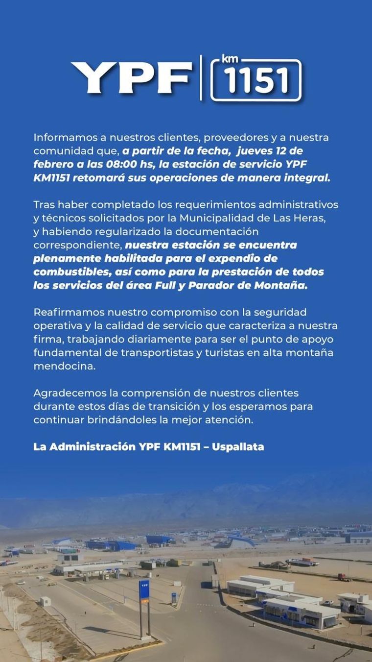 Rodrigo D'Angelo / MDZLa estación de servicio YPF de Uspallata, ubicada en el kilómetro 1151 de la Ruta Nacional 7, reabrió este jueves 12 de febrero a las 8.00 tras permanecer inhabilitada durante poco más de una semana. La reapertura fue confirmada a través de un comunicado oficial difundido por la administración del establecimiento.