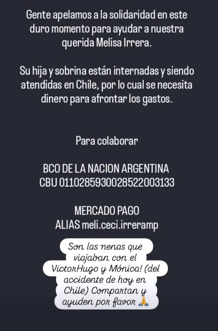 Luego del accidente, allegados a la familia de las víctimas y desde el colegio al cual asiste una de las niñas comenzaron a difundir una colecta para cubrir los gastos más urgentes. “La colecta la está haciendo la madre de una de las nenas, la hija mayor de Mónica. Es porque la medicina es súper costosa en Chile. Entiendo que es para poder traerlos a Argentina y afrontar lo que sigue”, explicaron a MDZ personas cercanas a la familia.