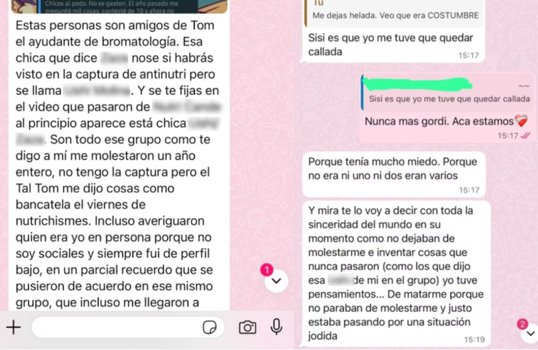Tras la difusión de los chats, una alumna que prefirió no revelar su identidad afirmó que también sufrió comportamientos hostiles por parte de las mismas personas mencionadas en los diálogos. Relató que durante un año recibió mensajes que la incomodaron, entre ellos expresiones que atribuía a Tom.
