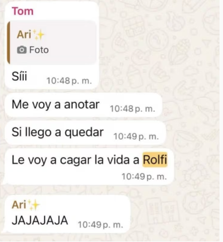 “Le voy a cagar la vida a Rolfi”, se puede leer el mensaje de un hombre identificado como Tom, en uno de los chats de WhatsApp que se filtraron tras el suicidio de Matías Rolfi. De acuerdo con las declaraciones de Rocío Rolfi, hermana del estudiante, a TN, Tom sería un ayudante de cátedra de la materia Bromatología en la Facultad de Medicina. Lo mismo sucede con Ariana, la mujer con la que conversaba en el chat.