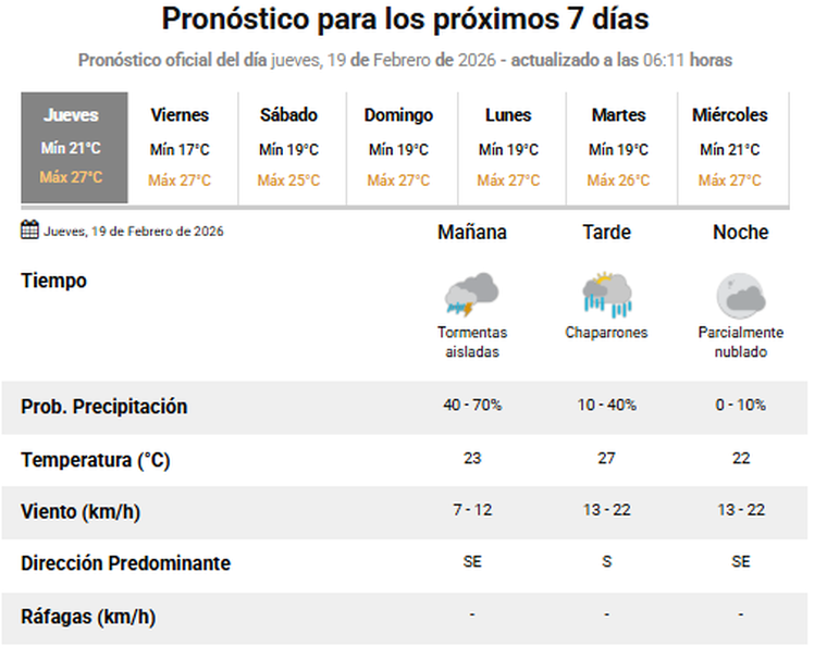 - Domingo: Nublado. Mínima de 19° y máxima de 27°