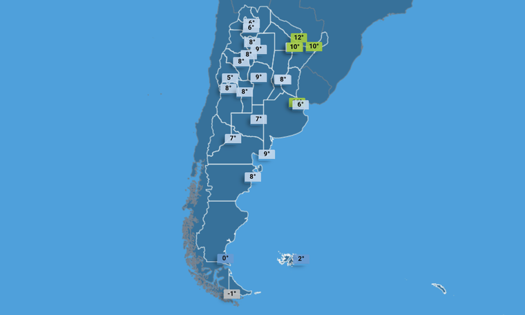 - Ushuaia: mínima de -1°C y máxima de 4°C, cielo mayormente nublado con lluvias y nevadas a partir de la noche.