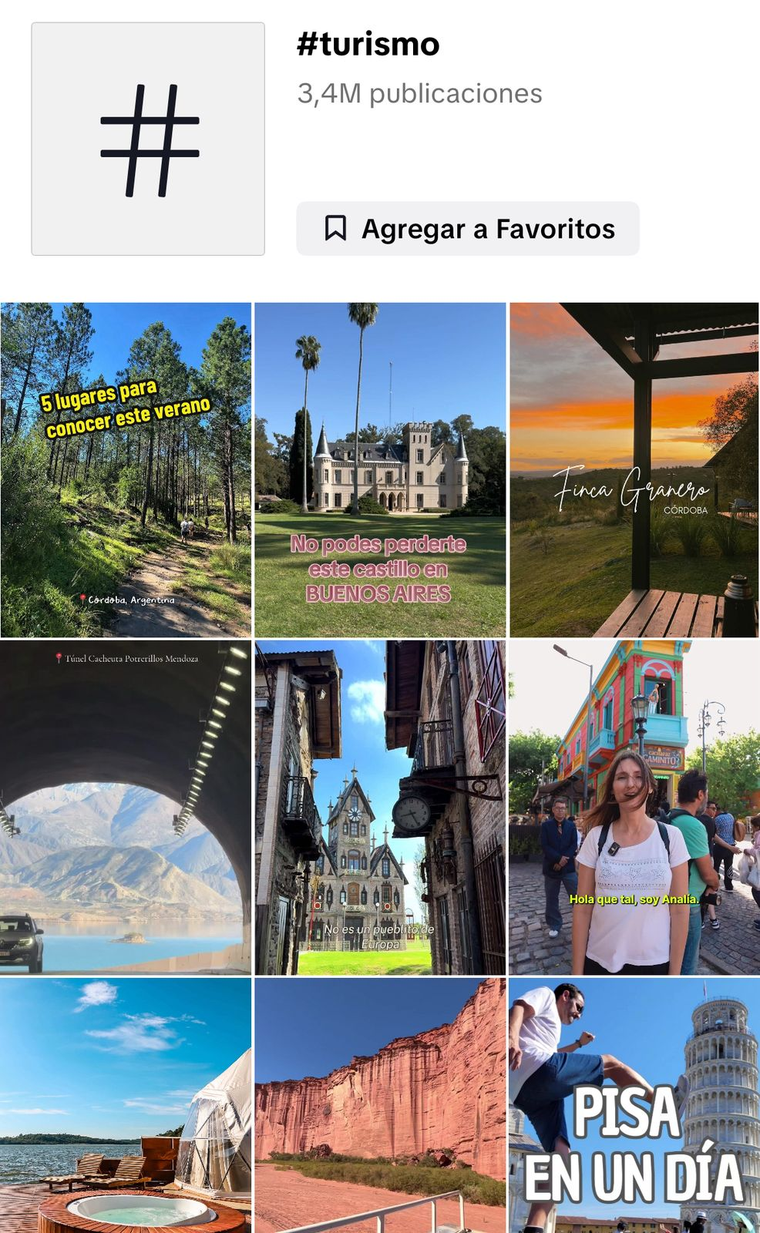 Los hashtags vinculados al tema marcan la tendencia: #Turismo superó los 1.000 millones de visualizaciones en 12 meses, #Viajes alcanzó casi 875 millones, #Vacaciones 450 millones y #TravelTok, 108 millones.