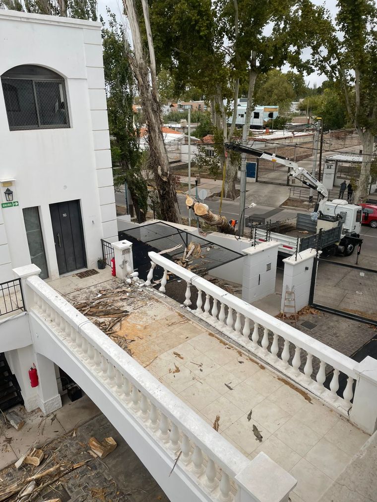 Sobre el incidente ocurrido, el vecino destacó que el impacto del árbol provocó daños en la baranda superior de los departamentos y en la zona de cocheras.