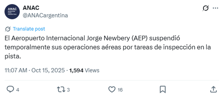 El episodio implicó al vuelo AR1526, de acuerdo con información de fuentes de Aerolíneas Argentinas, el cual tuvo una falla en el motor número uno apenas iniciado el despegue hacia la provincia de Córdoba. Actualmente, se está investigando la causa del desperfecto.