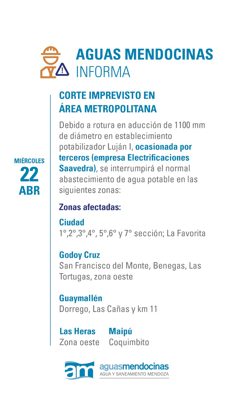 Aguas Mendocinas informó un corte imprevisto por la rotura de una cañería en Luján I. Afecta a Ciudad y varios departamentos del Gran Mendoza.