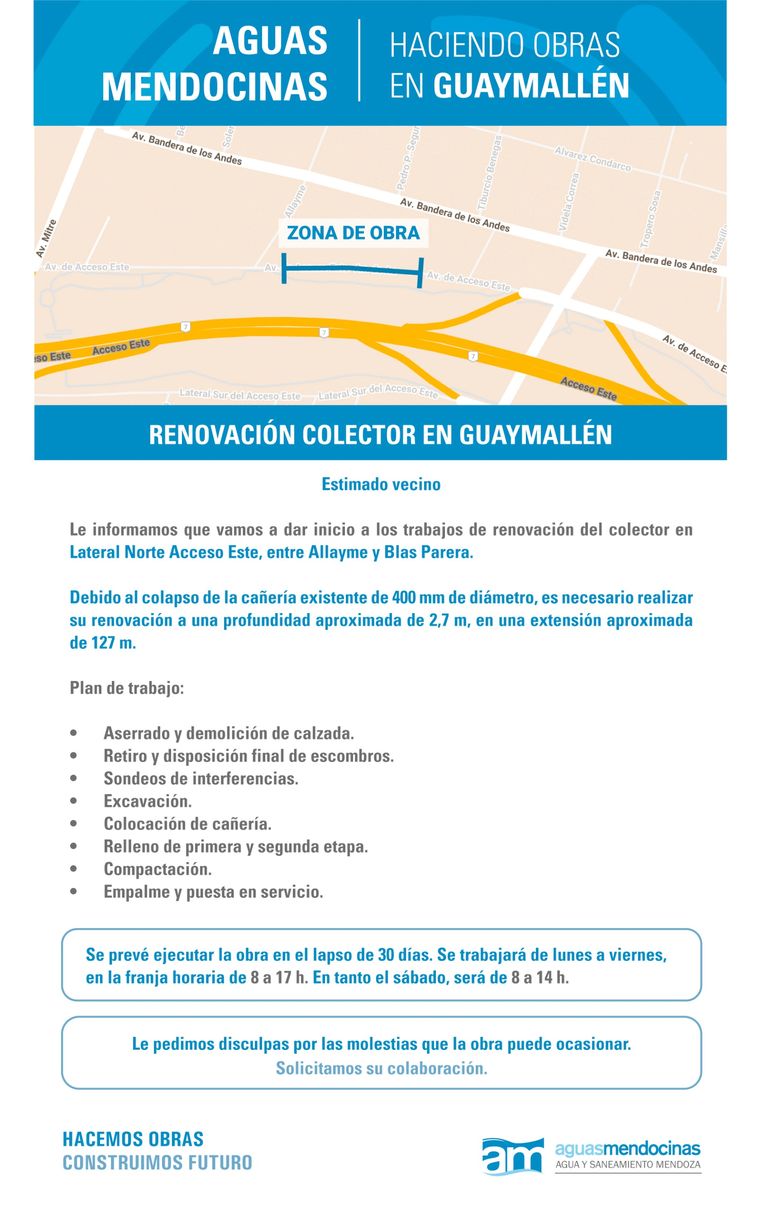 "Debido al colapso de la cañería existente de 400 mm de diámetro, Aguas Mendocinas dio inicio a la renovación del colector en Lateral Norte Acceso Este, entre Allayme y Blas Parera. Los trabajos se realizarán a una profundidad de 2,7 m y en una extensión de 127 m", expresaron desde Aguas Mendocinas y agregaron que el plazo de ejecución de la obra es de aproximadamente 30 días.