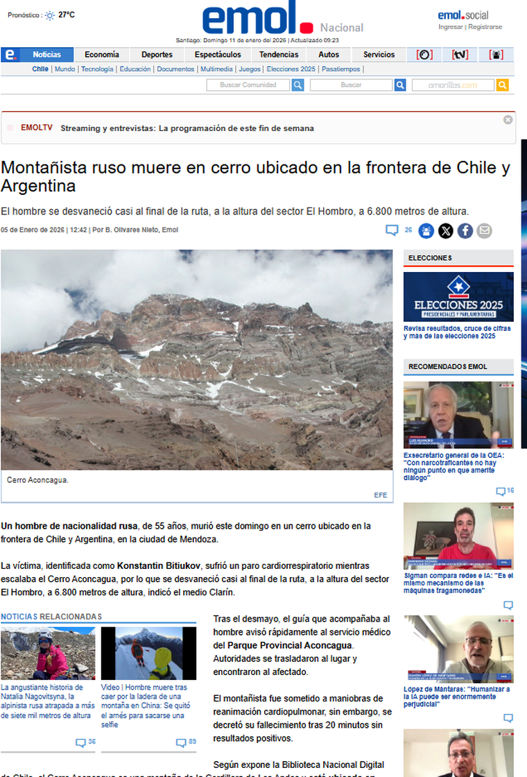 Una reciente de Emol, la versión digital del diario chileno El Mercurio, informó sobre la muerte de un montañista ruso durante una expedición en el Aconcagua. El hecho, lamentable y sensible, fue abordado con un título que llama la atención: “Montañista ruso muere en cerro ubicado en la frontera de Chile y Argentina”.