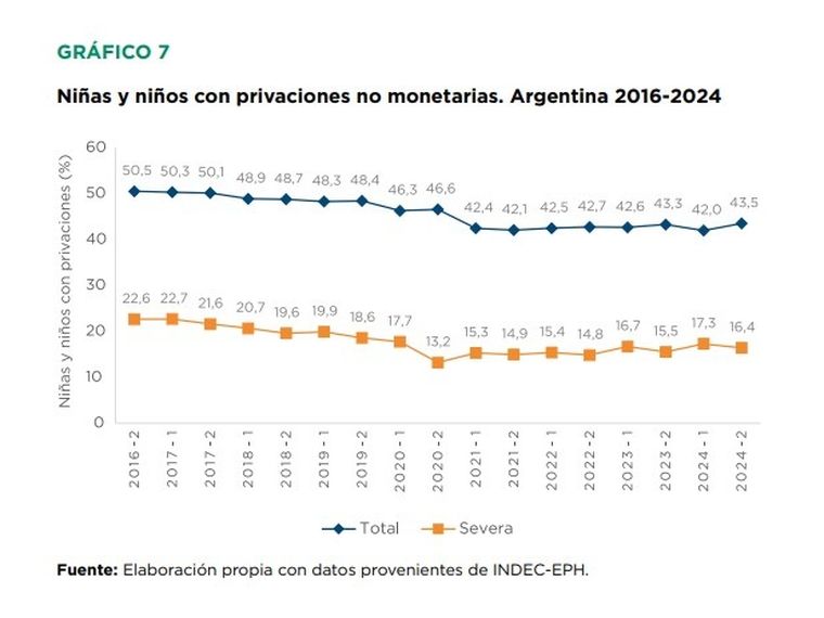 Mientras que las privaciones totales manifestaron un aumento del 1,5%, pasando del 42% al 43,5% en el segundo semestre de 2024, en lo que refiere a la las privaciones severas se registró una baja de casi un punto, pasando del 17,3% al 16,4%.