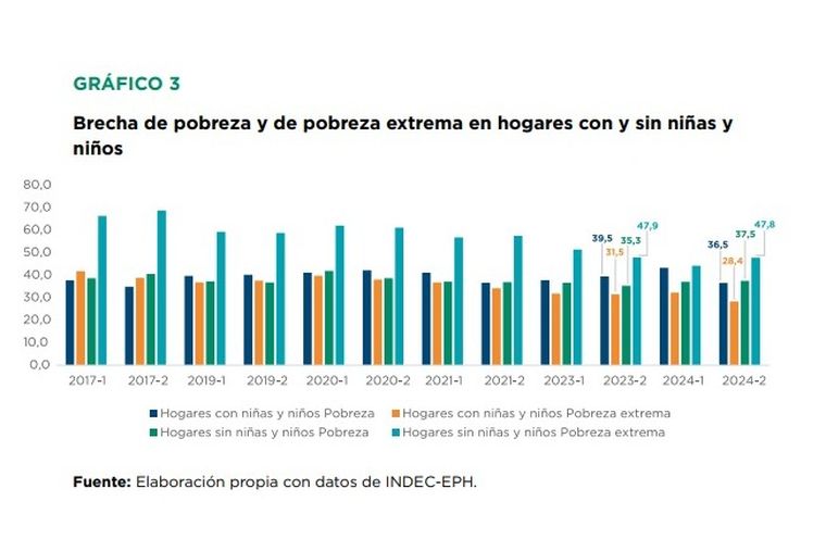 Según Unicef, "El análisis de la pobreza infantil requiere no solo saber cuántas niñas y niños viven en hogares por debajo de la línea de pobreza, sino también cuán lejos se encuentran esos hogares del umbral que define dicha condición". En este sentido, cabe destacar que el mismo informe indica que "en el segundo semestre de 2023, la brecha promedio en hogares pobres con niñas y niños era del 39,5%, mientras que en los hogares indigentes la brecha alcanzaba el 31,5%".