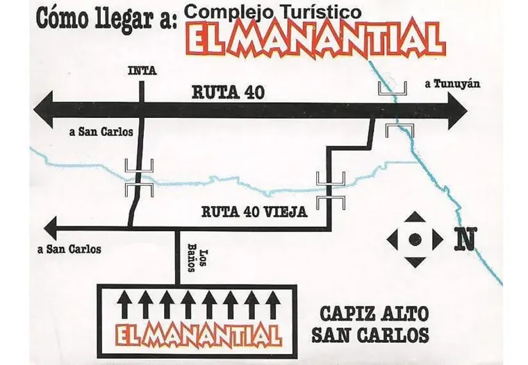 Para llegar al complejo turístico El Manantial desde la Ciudad de Mendoza hay que tomar la ruta 40 hacia el sur, pasar el centro de Tunuyán y girar hacia el este en la primera calle pasando el río Tunuyán. Finalmente, seguir por Carril Nacional hasta Los Baños.
