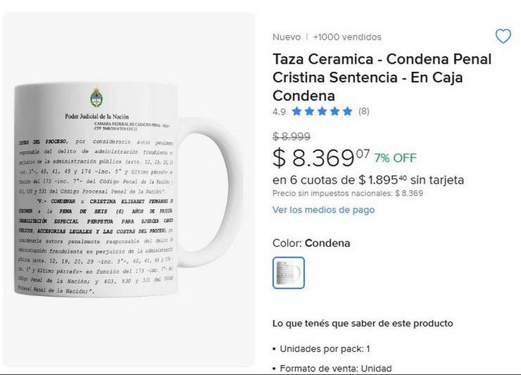 Según la publicación en Mercado Libre, la taza es de cerámica sublimada y muestra el fallo de la Corte Suprema contra Cristina Kirchner.